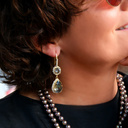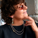 So, let’s not treat ourselves too seriously, and follow Evelyne’s style: colorful, fun, but still chic. Her bracelets sparkle while sitting comfortably on your wrist, and you can wear them with just a white linen shirt. Her earrings are for when you want to emanate light!