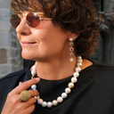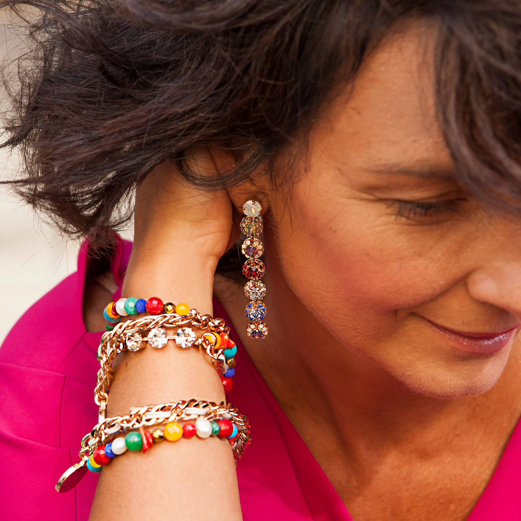 So, let’s not treat ourselves too seriously, and follow Evelyne’s style: colorful, fun, but still chic. Her bracelets sparkle while sitting comfortably on your wrist, and you can wear them with just a white linen shirt. Her earrings are for when you want to emanate light!