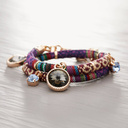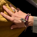 So, let’s not treat ourselves too seriously, and follow Evelyne’s style: colorful, fun, but still chic. Her bracelets sparkle while sitting comfortably on your wrist, and you can wear them with just a white linen shirt. Her earrings are for when you want to emanate light!