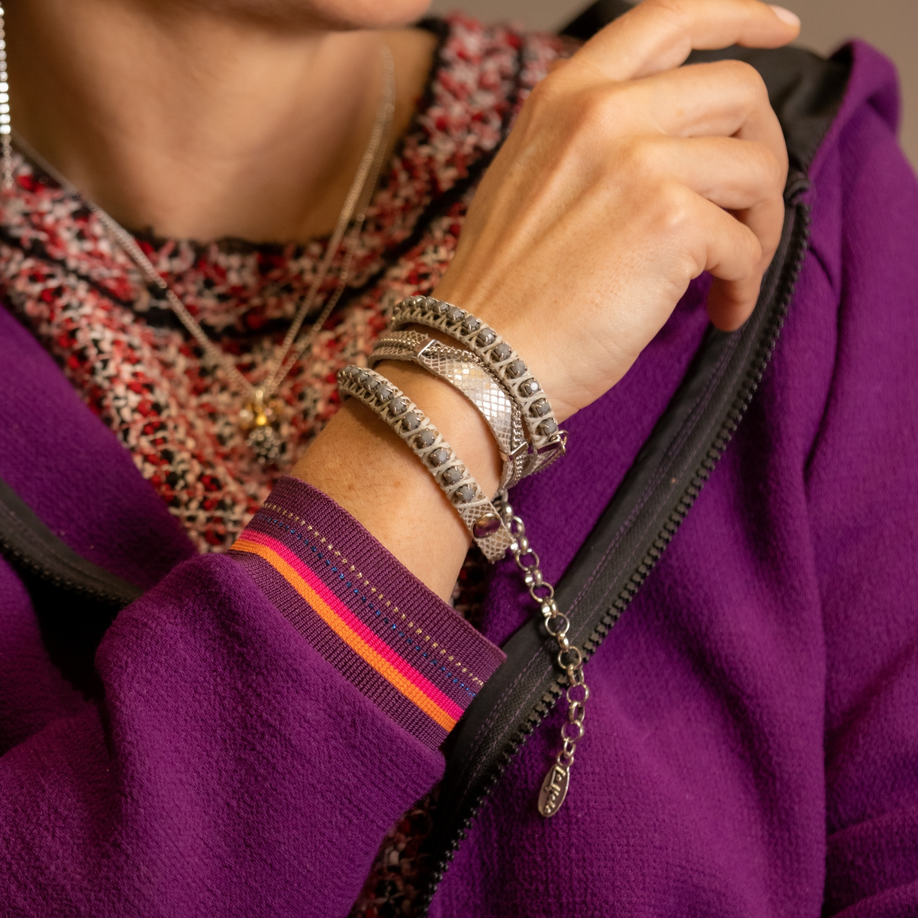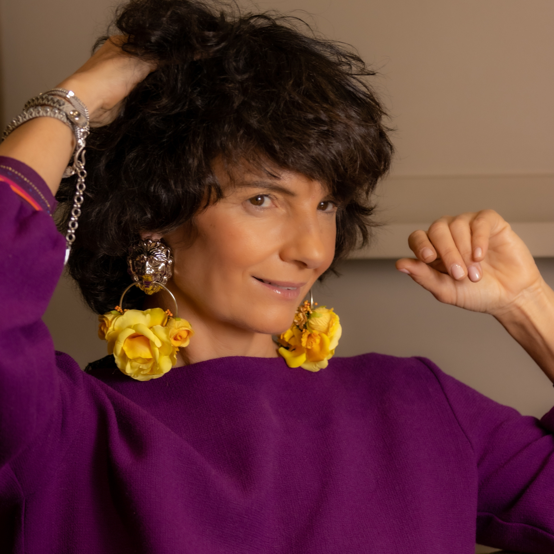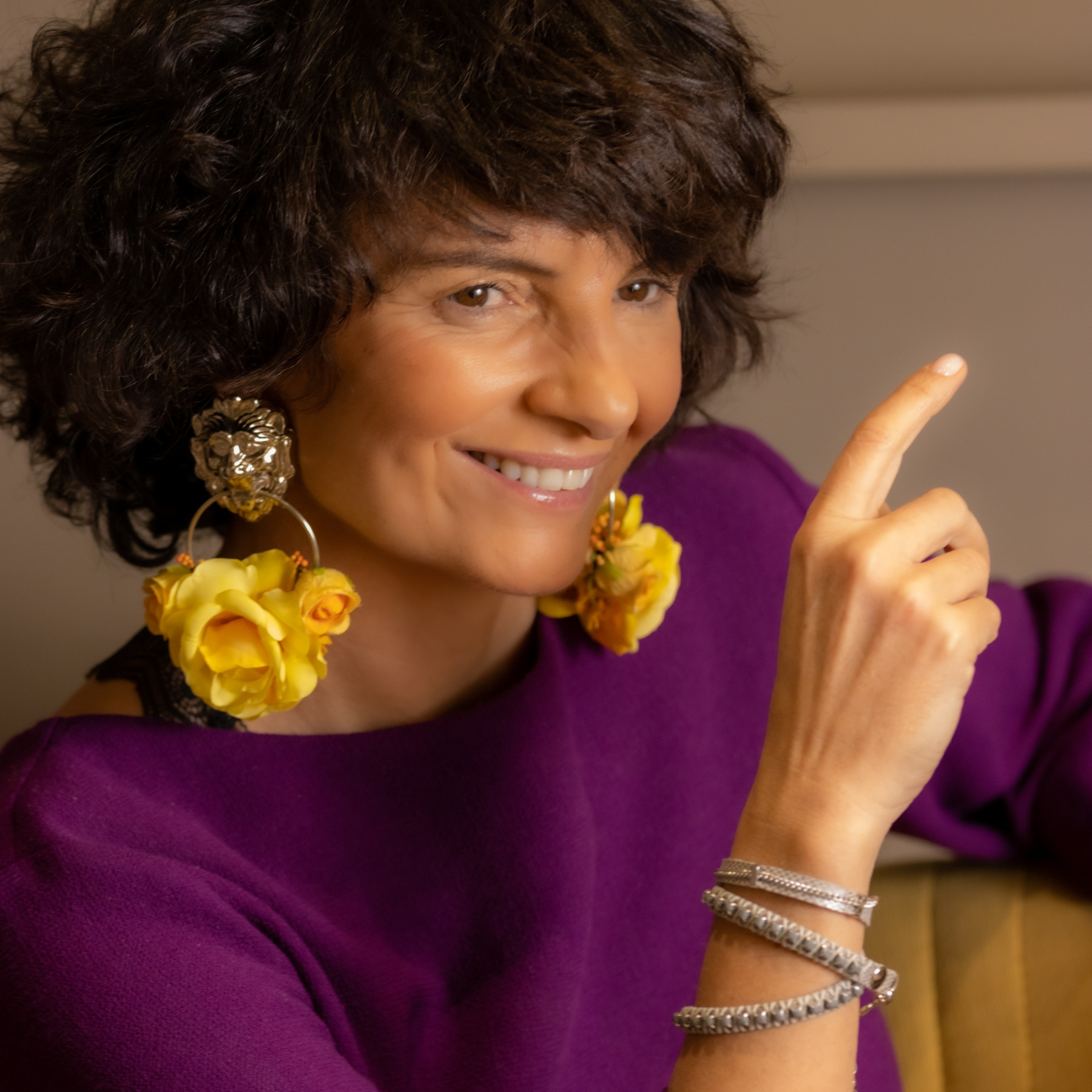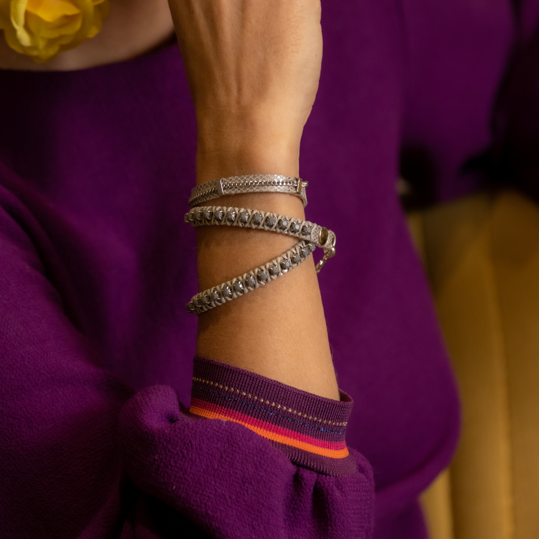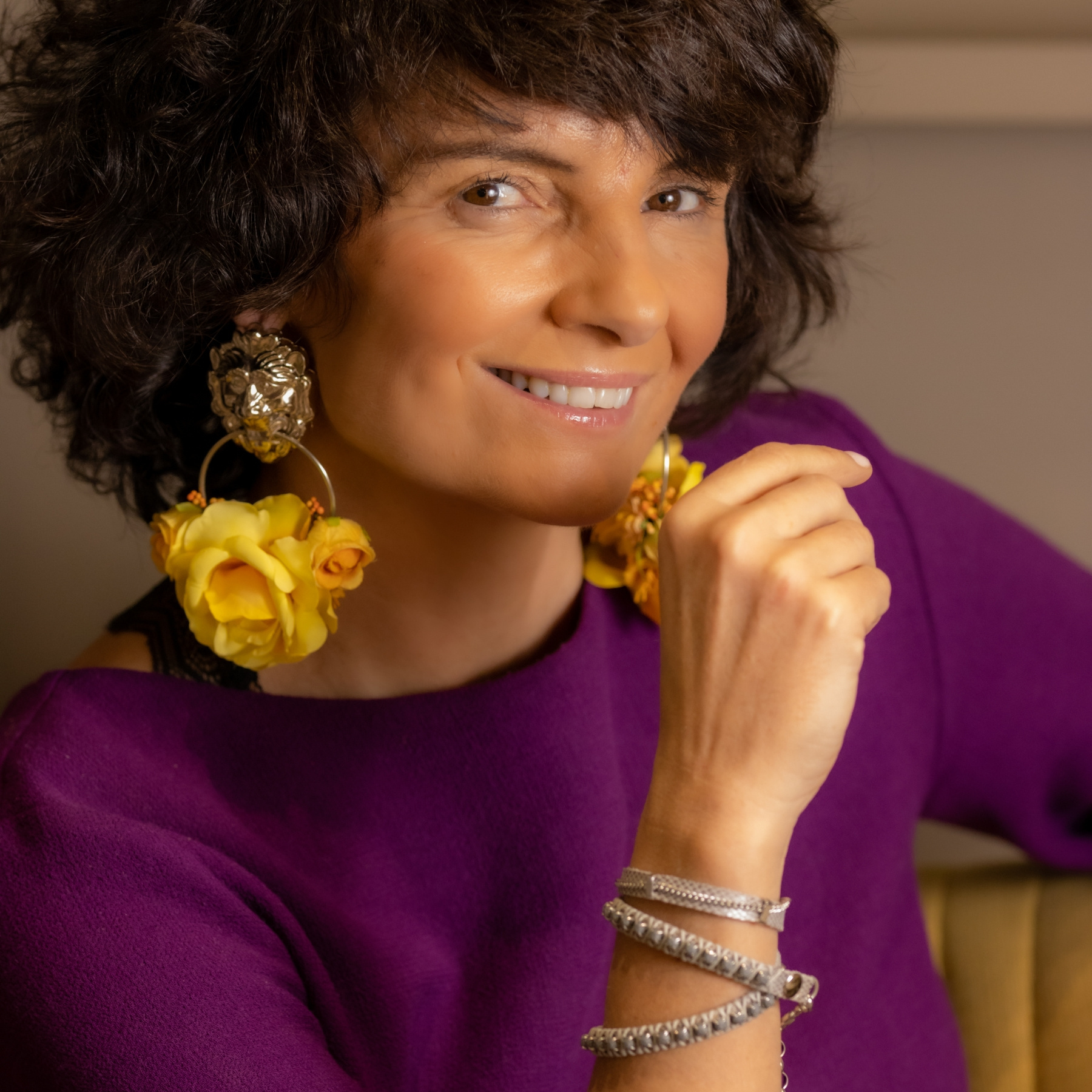 So, let’s not treat ourselves too seriously, and follow Evelyne’s style: colorful, fun, but still chic. Her bracelets sparkle while sitting comfortably on your wrist, and you can wear them with just a white linen shirt. Her earrings are for when you want to emanate light!