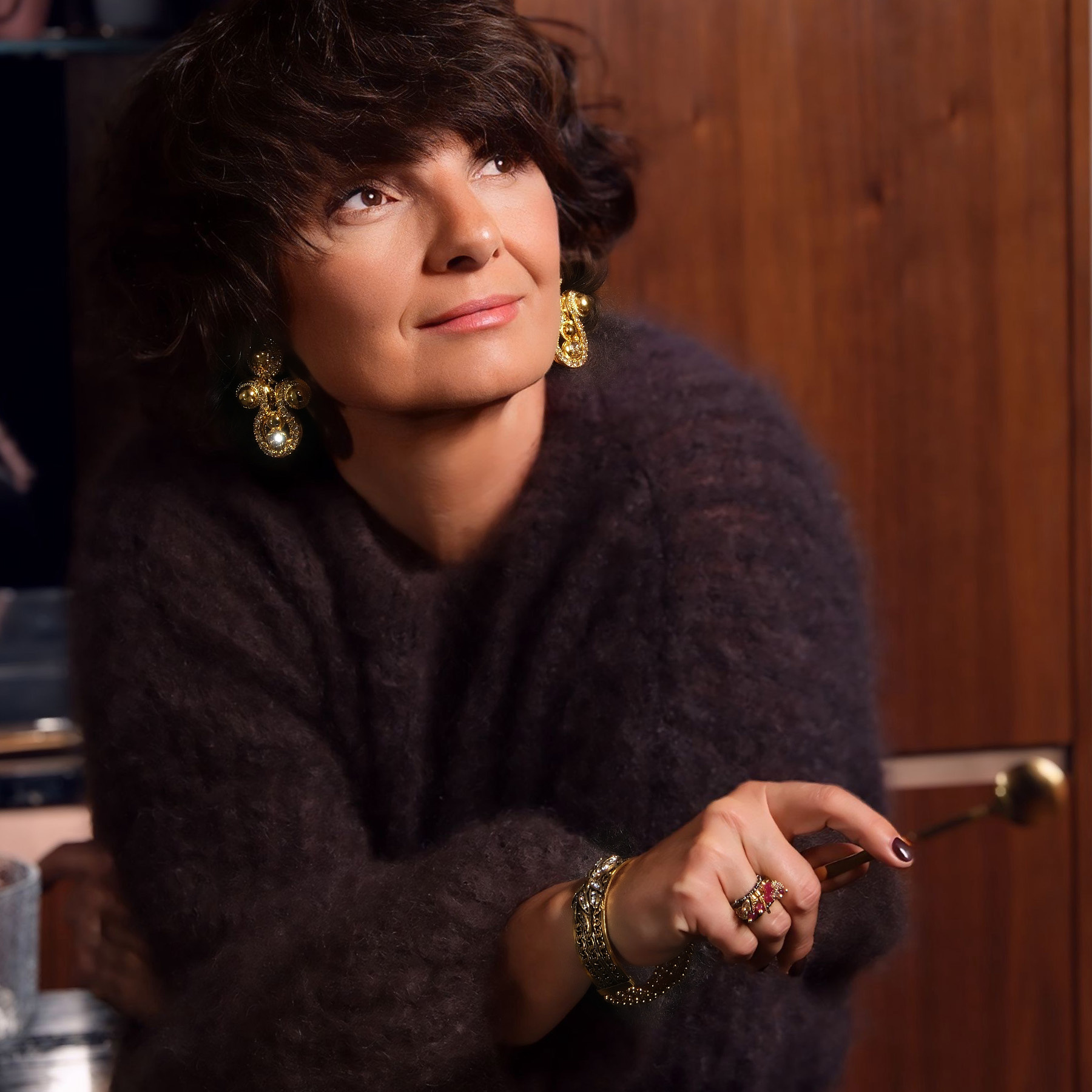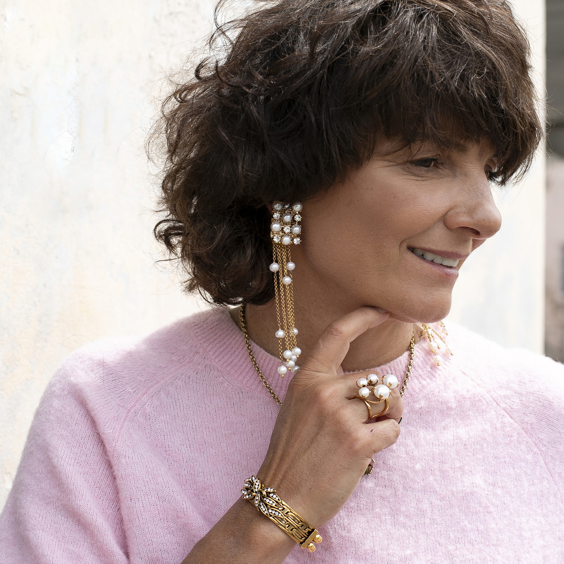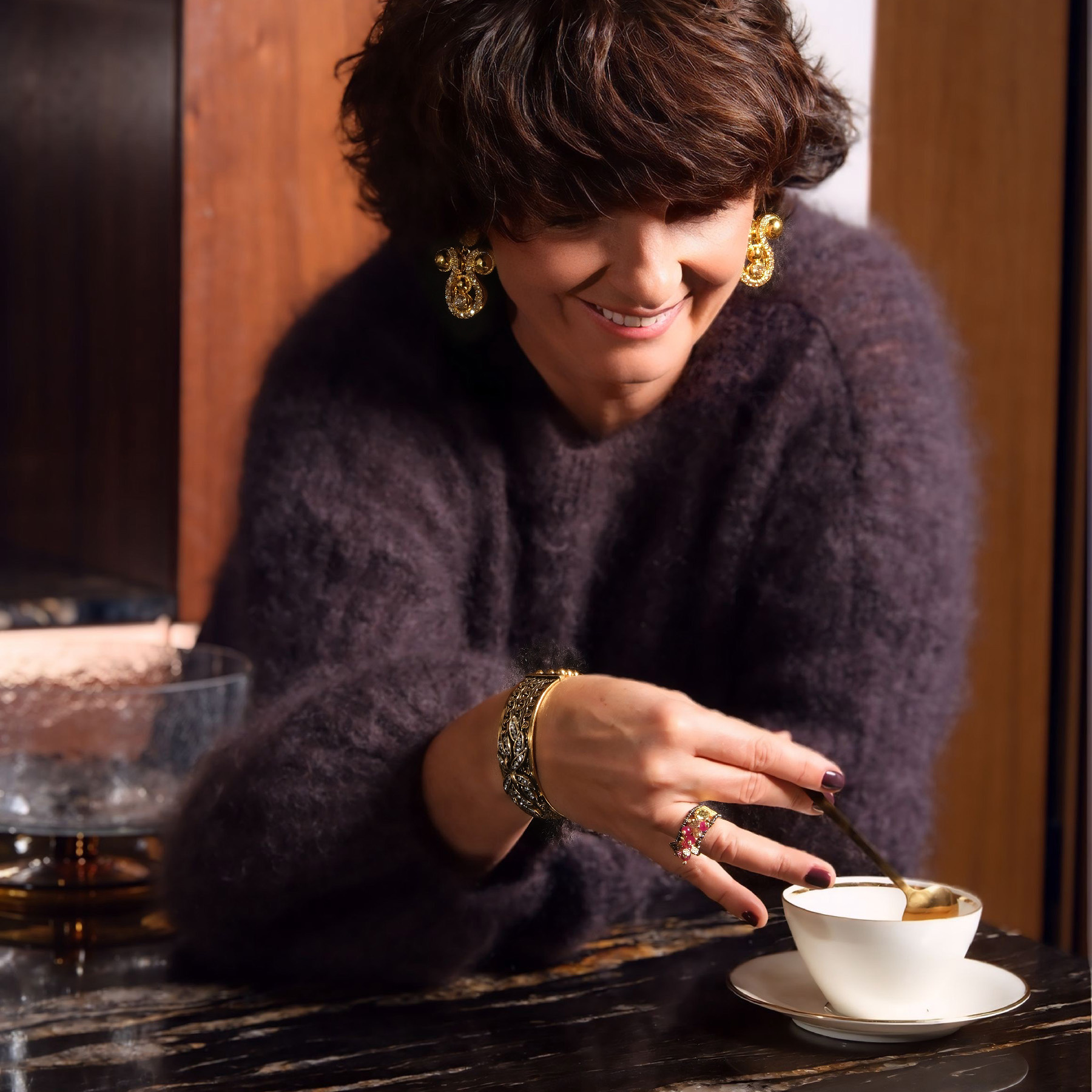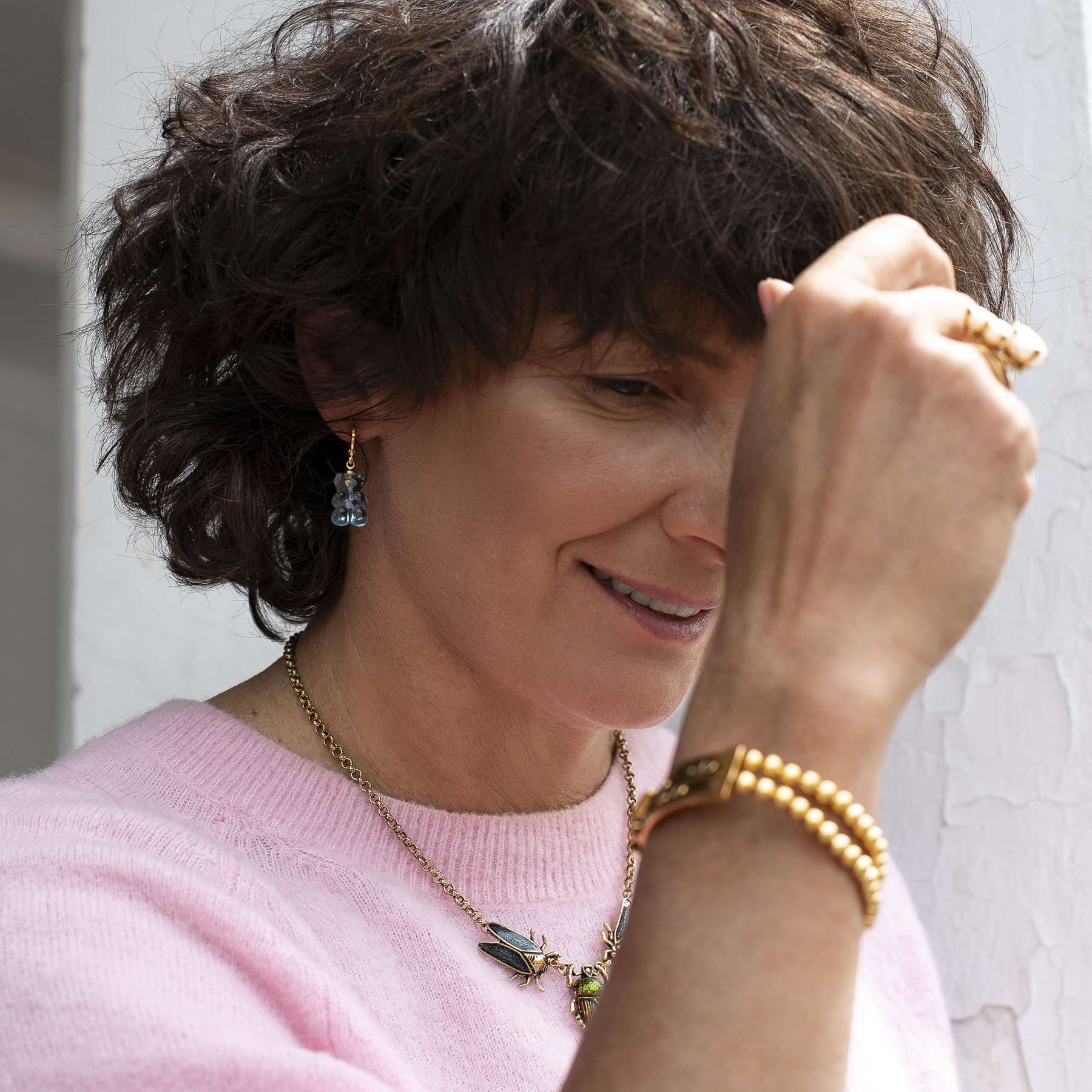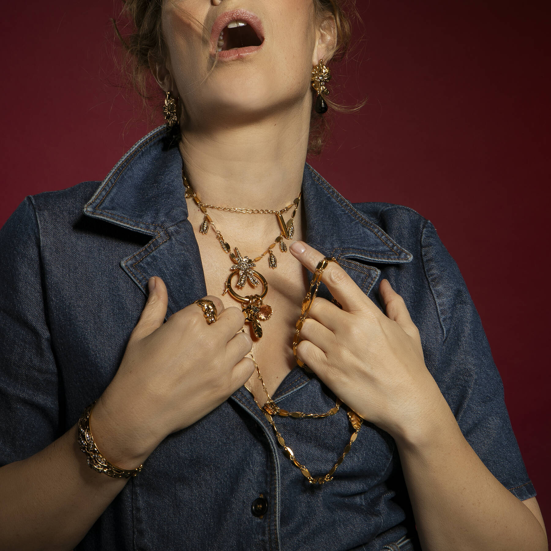 Blue velvet shirt. A ring with an eyelet in the same color will be a great choice for an elegant dinner. Pdline the styling with a barnette with a leaf motif.
