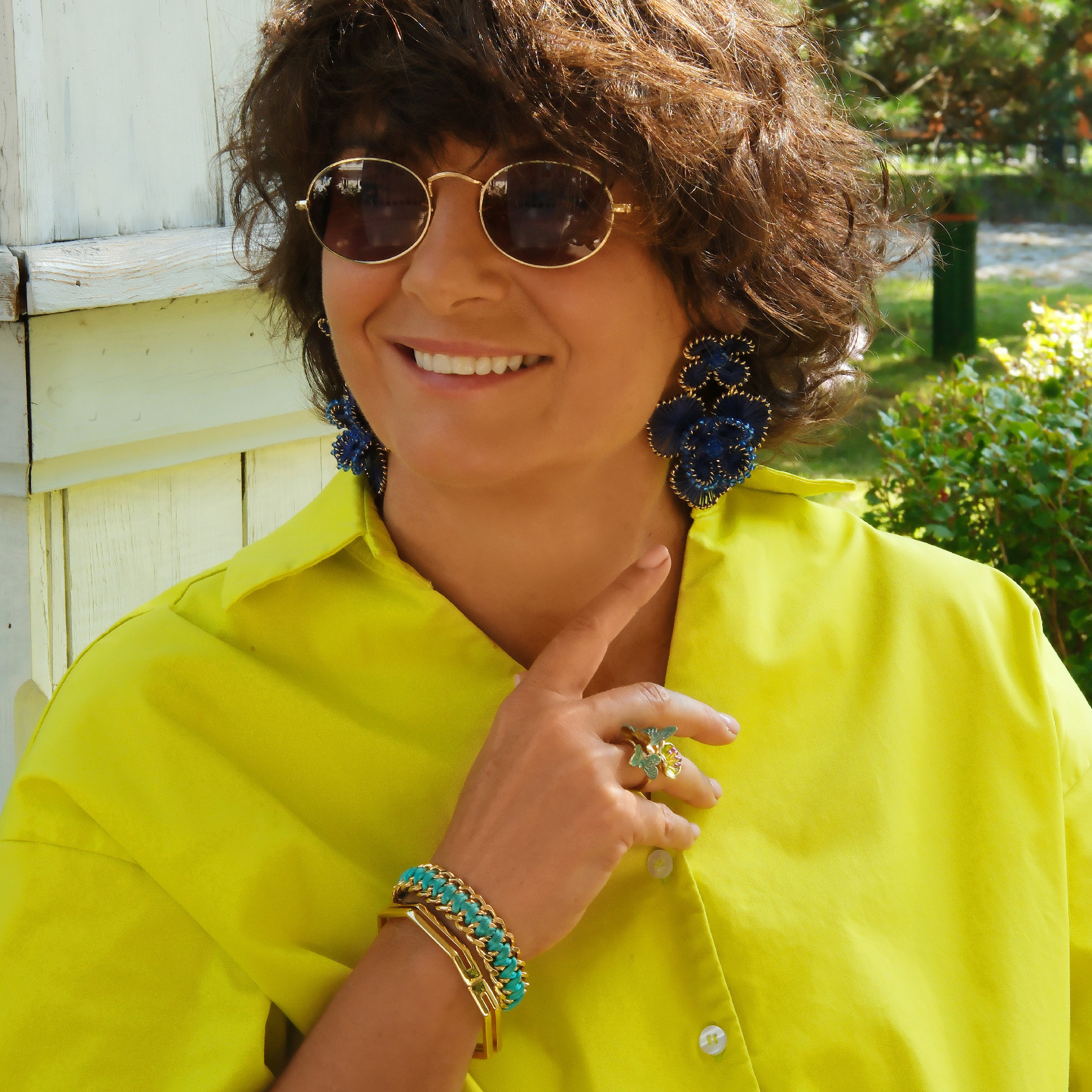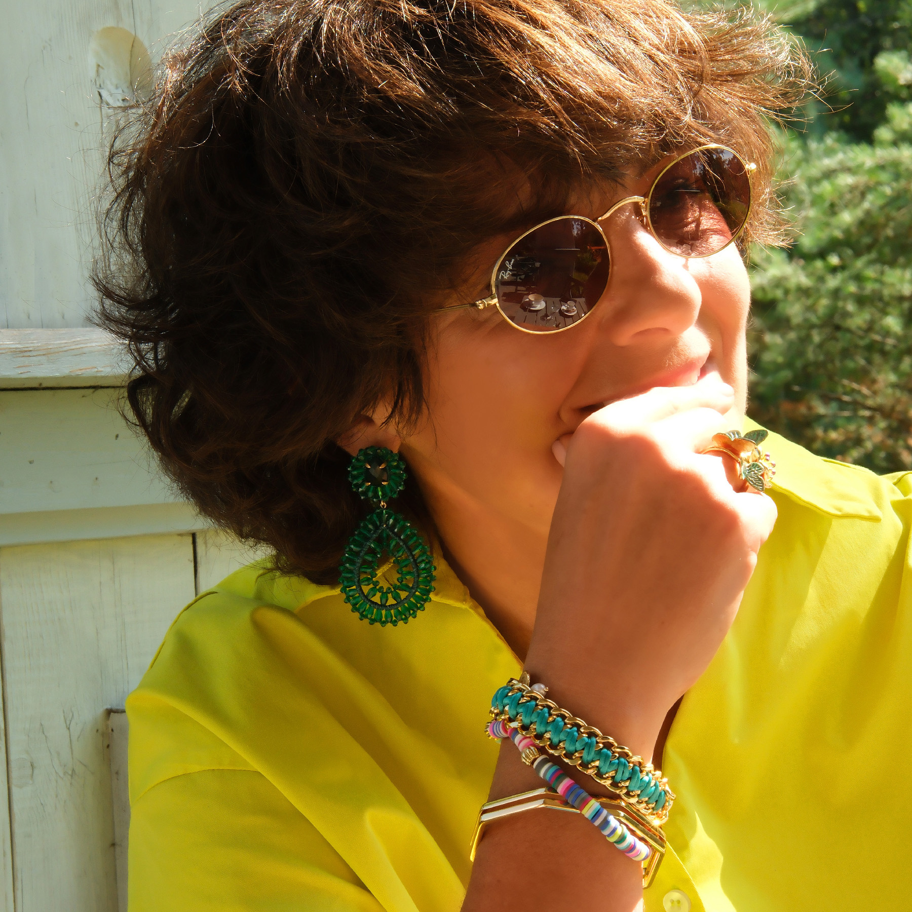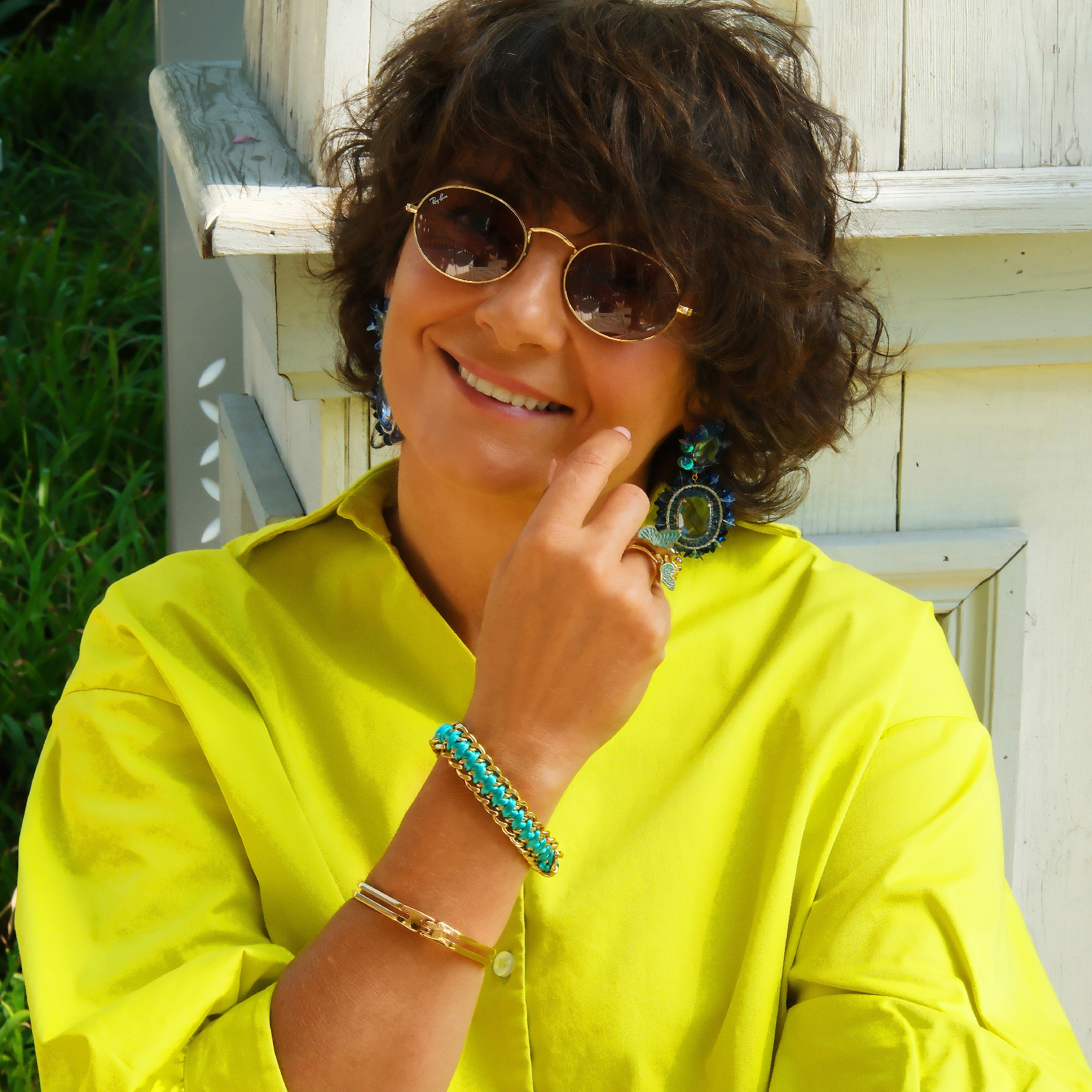 An octagonal, gold plated cuff bracelet. Made of a super light and skin-safe metal alloy. Great accessory to wear at the office, with a white shirt and a beautifully printed silk scarf. In the evening, wrap the scarf around your head and add hoops.