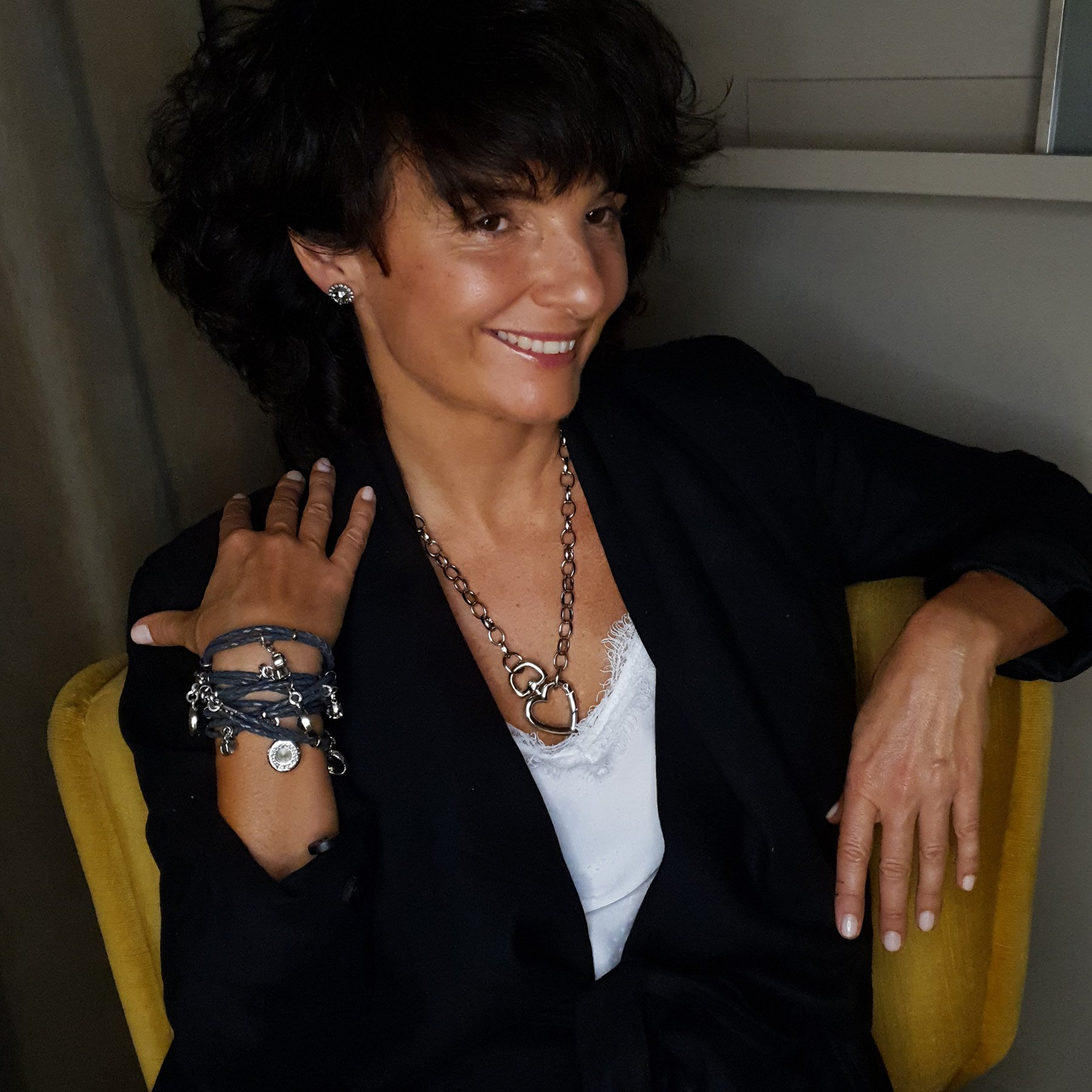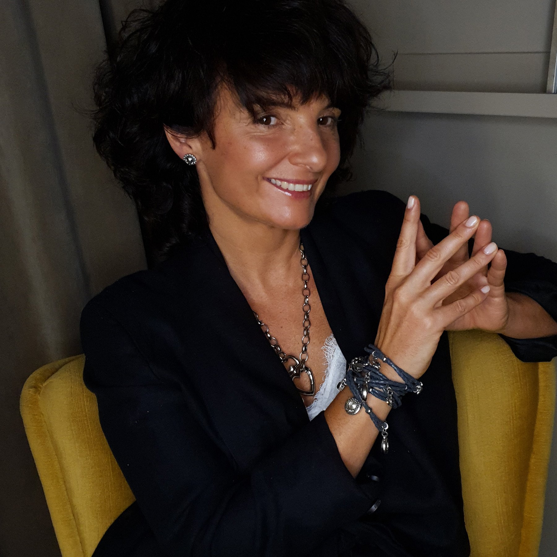 So, let’s not treat ourselves too seriously, and follow Evelyne’s style: colorful, fun, but still chic. Her bracelets sparkle while sitting comfortably on your wrist, and you can wear them with just a white linen shirt. Her earrings are for when you want to emanate light!