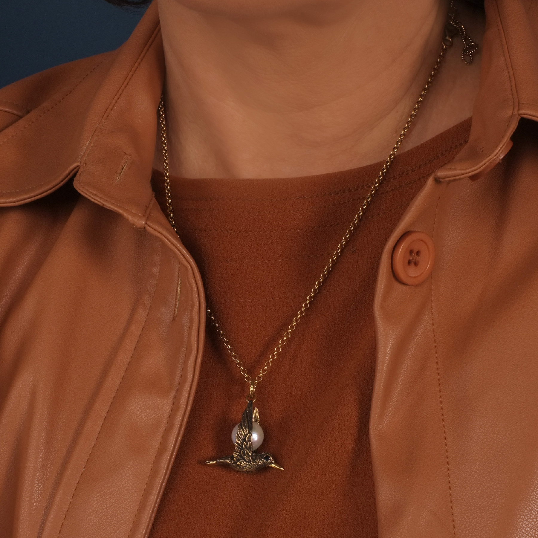 • Short chain necklace with a hummingbird. Made of gold plated brass and adorned with a freshwater pearl and sapphires. A unique accessory which will define your whole style. Beautifully hand made in Florence. Symbolizes love and magic.