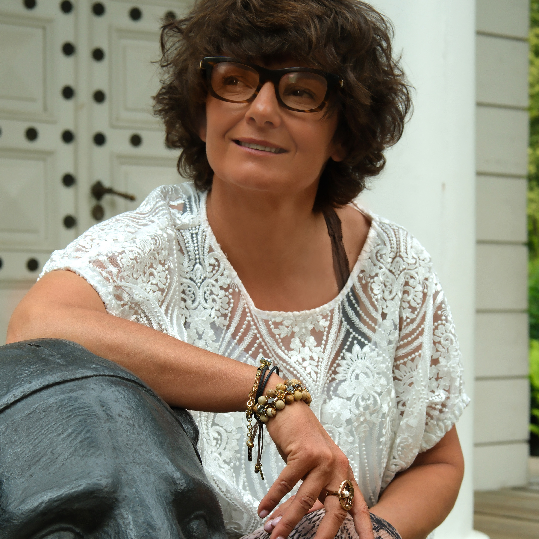 So, let’s not treat ourselves too seriously, and follow Evelyne’s style: colorful, fun, but still chic. Her bracelets sparkle while sitting comfortably on your wrist, and you can wear them with just a white linen shirt. Her earrings are for when you want to emanate light!