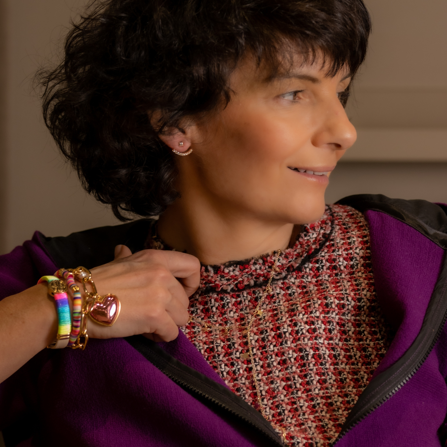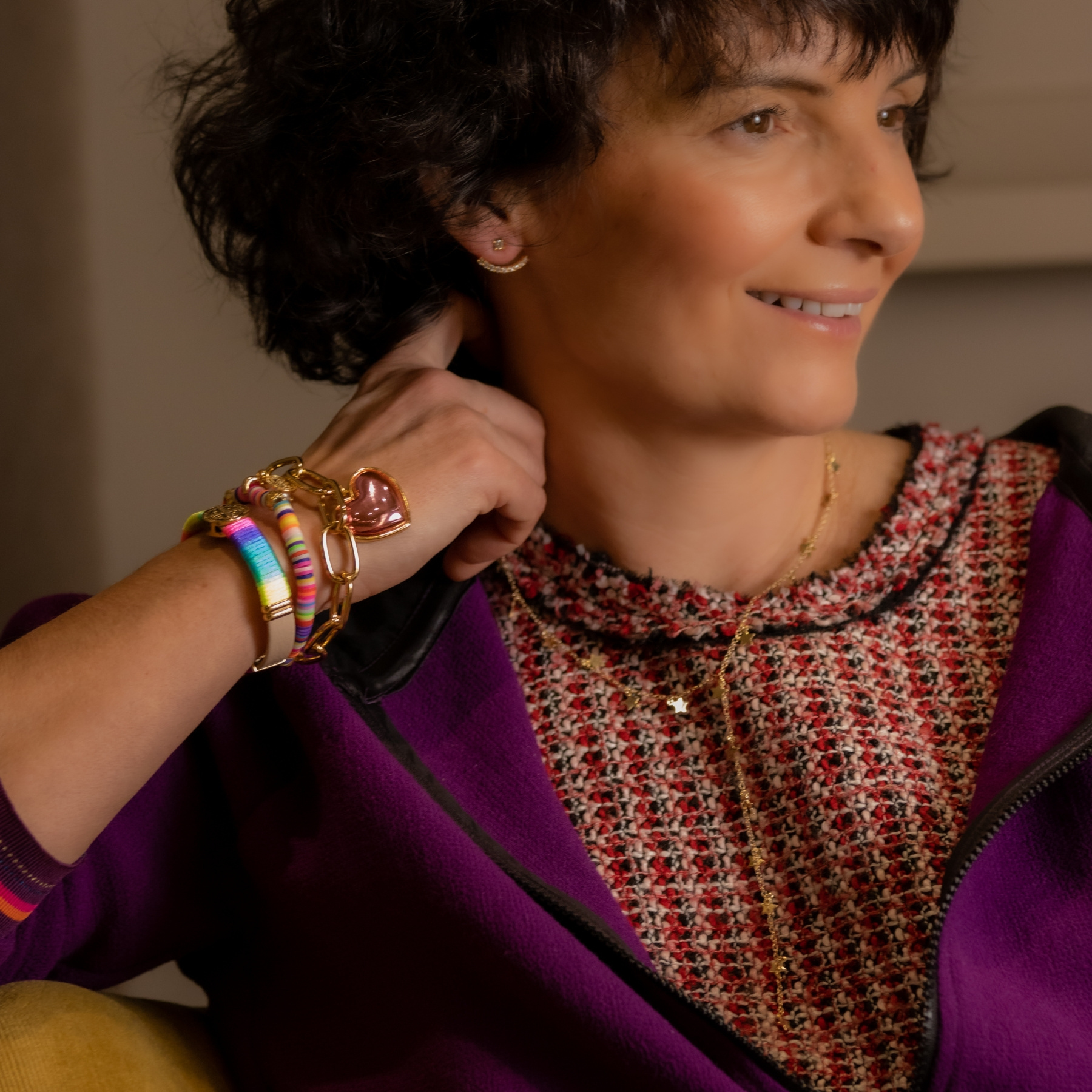 Marianna's favorite colors. It combines bracelets made of various materials: resin and cord. He mixes the colors of the bracelets and combines them with crumpled linen!